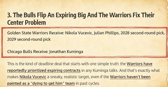 美媒《Fadeaway World》撰文建议,勇士应该考虑将库明加送到公牛,换回武切维奇、菲利克斯以及两个次轮签。