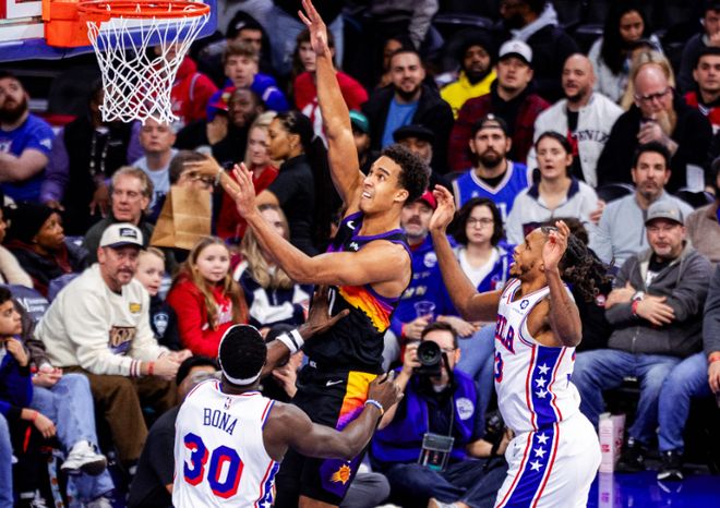 重新回到赛场,布克和杰伦格林继续轮番带队冲击76人的防线,在场均能够砍下20.9分的狄龙哑火,疯狂打铁全场只得到6分的情况下,布克扛起了首发五虎的得分大旗,靠着23次出手命中9球的发挥,贡献了27分、3个篮板、4次助攻和1个抢断的数据。