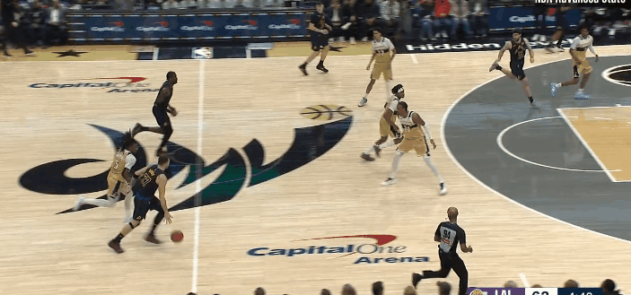图1,萨尔夹击卢卡,卢卡起跳,还扫了一眼三分线,这才天马行空划给顺下艾顿,艾顿内切。