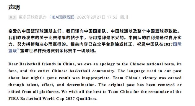 骚操作!用词不当翻车,FIBA正式致歉中国男篮,评论区直接炸了