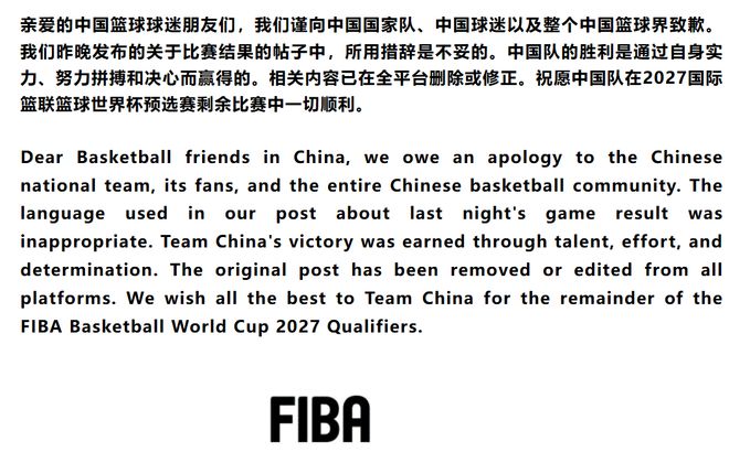 幸好在无数球迷轰炸评论区的情况下,FIBA也在社交网站上进行了道歉,他们明确表示:谨向中国国家队、中国球迷以及整个中国篮球界致歉。关于比赛结果的帖子中,所用措辞是不妥的。中国队的胜利是通过自身实力、努力拼搏和决心而赢得的。对于这样的道歉还算可以接受,因为他们点名了道歉的对象,也点名了错误的地方,这是国内球迷可以接受的。只是外网有没有发不清楚。