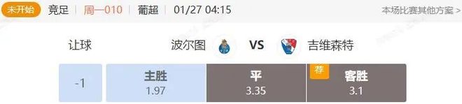 目前竞彩数据来看,给出对波尔图在主场的支持明显比以往保守,对波尔图的信心并不充足,本场看波尔图最多小胜。