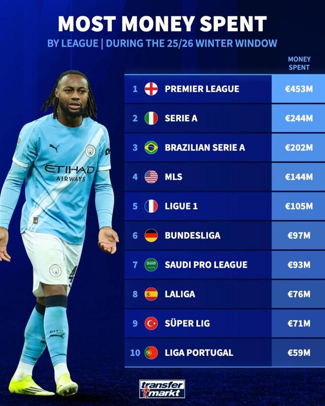 北京时间2月3日,德转统计出了2026年冬窗转会支出最高的10个联赛,英超以4.53亿欧元断档领先,意甲2.44亿欧元第二,巴甲2.02亿欧元第三,西甲仅支出7600万欧元位列第8。